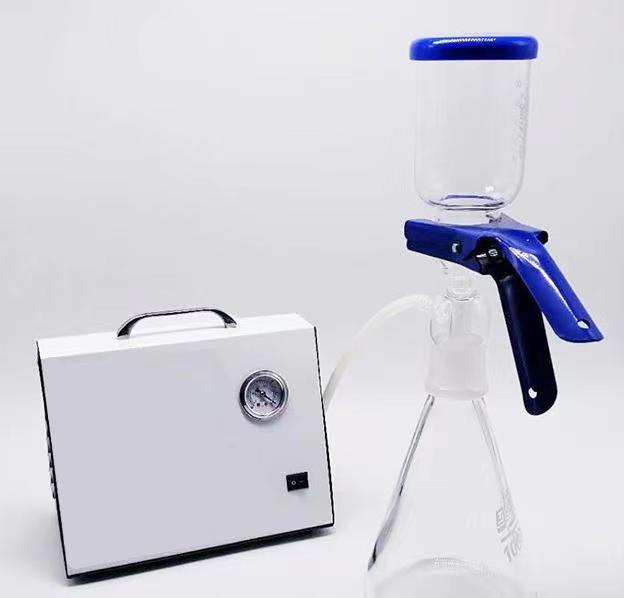 真空泵是提高過濾效率,加強脫氣效果的重要過濾配套設(shè)備。為保障過濾介質(zhì)不被污染,一般均使用無油隔膜式真空泵,此類泵型是通過橡膠膜片的往返運動形成真空,其真空壓力一般為0.08Mpa左右(單級),提高過濾速度關(guān)鍵是單位時間內(nèi)的排氣量,及真空泵的流量指標(biāo),在過濾量大、介質(zhì)粘度高時顆粒堵塞濾膜情況下尤顯突出。